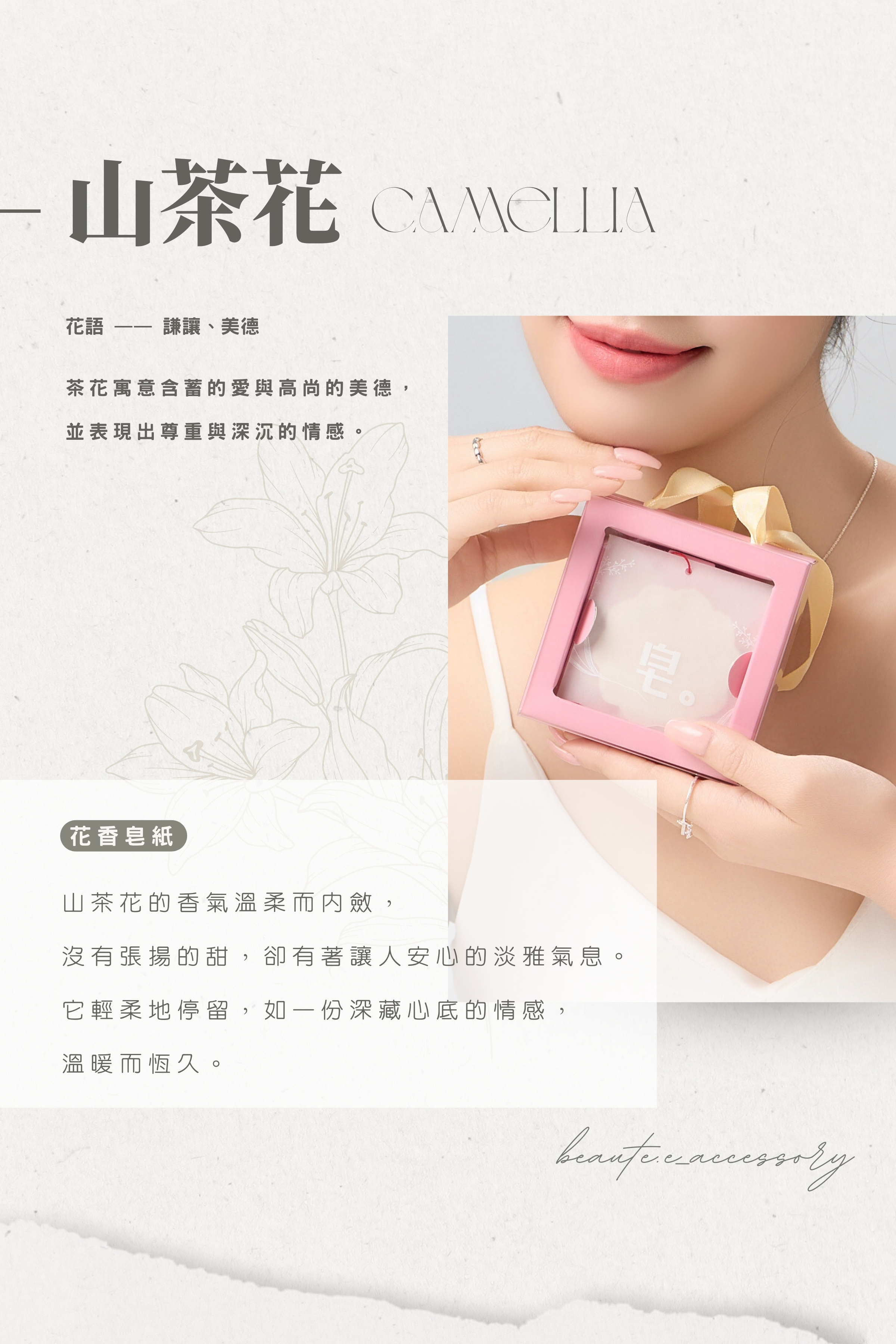 以立體花形設計呈現山茶花柔和的花瓣線條,