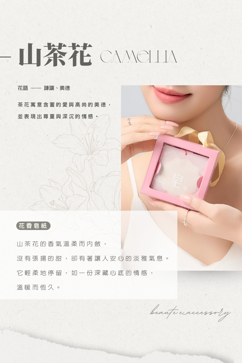 中央點綴細緻山茶花飾,