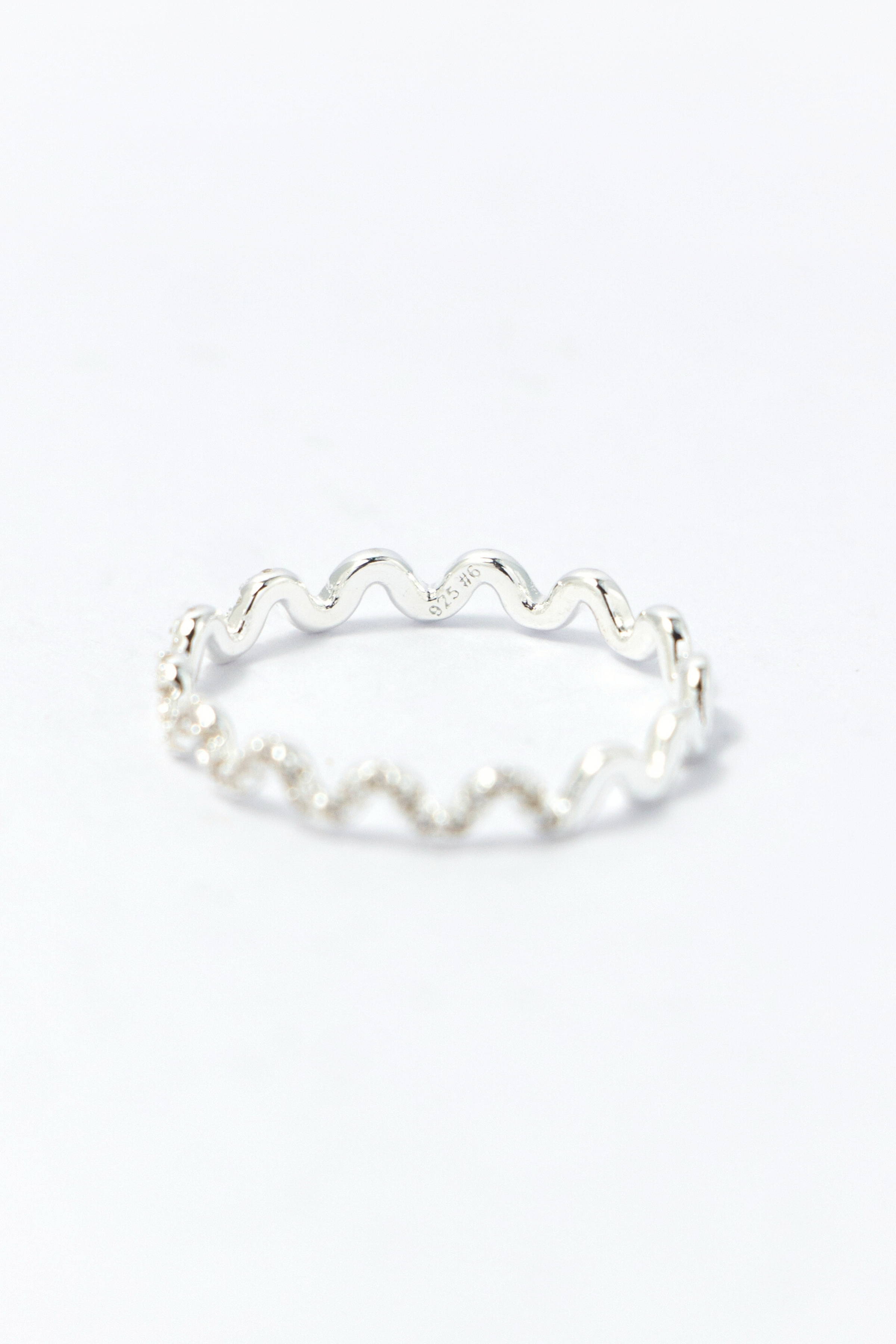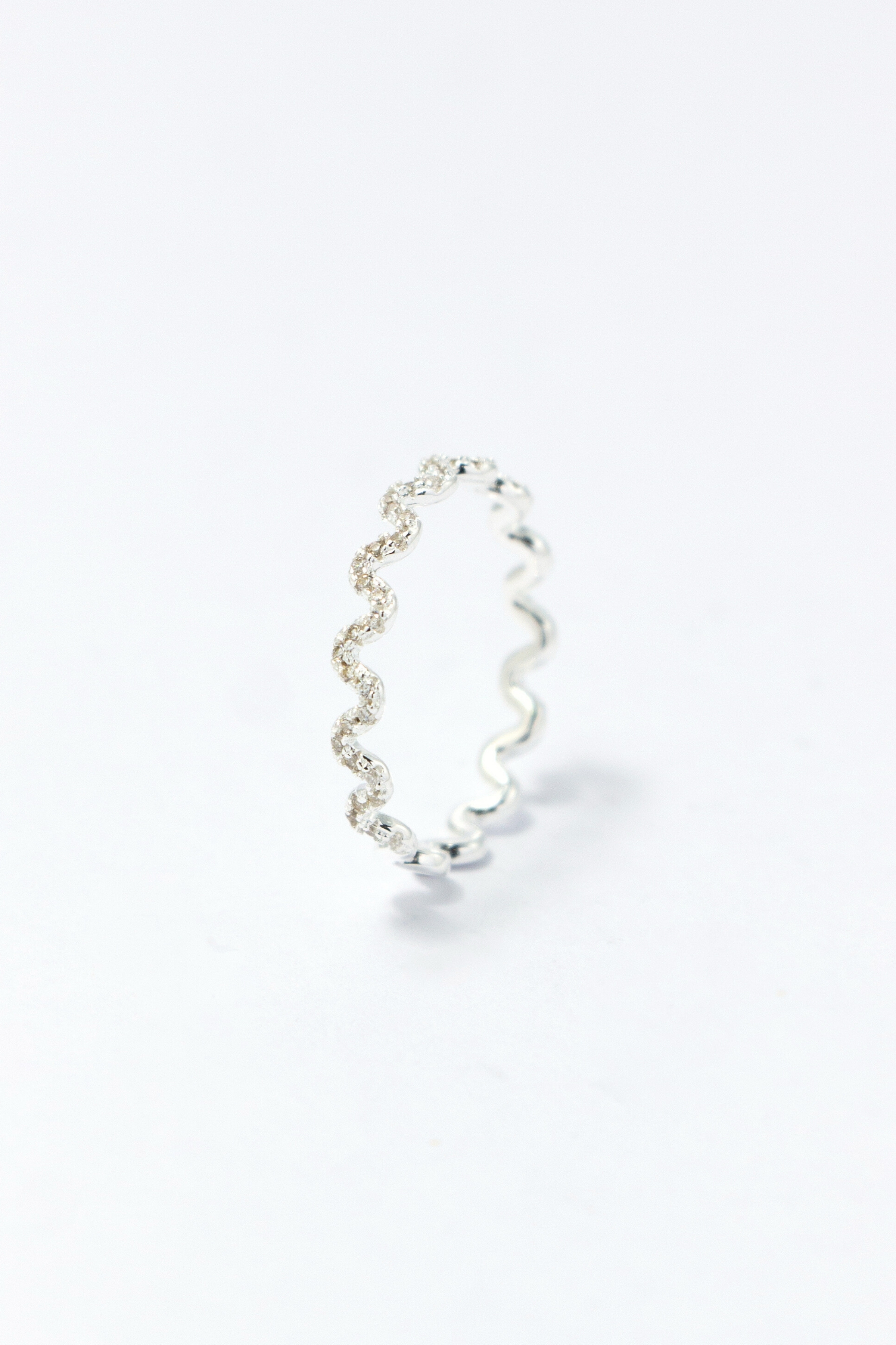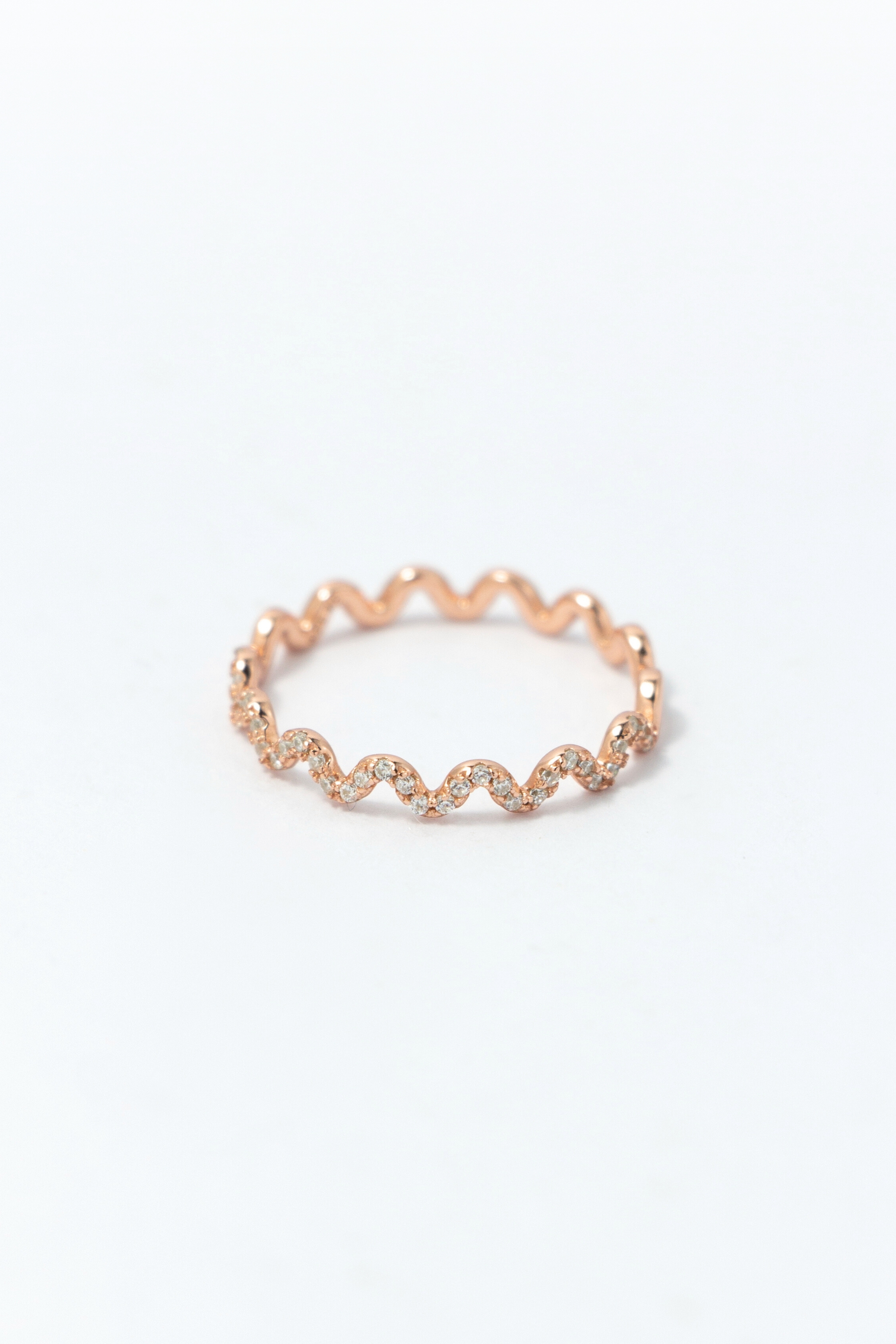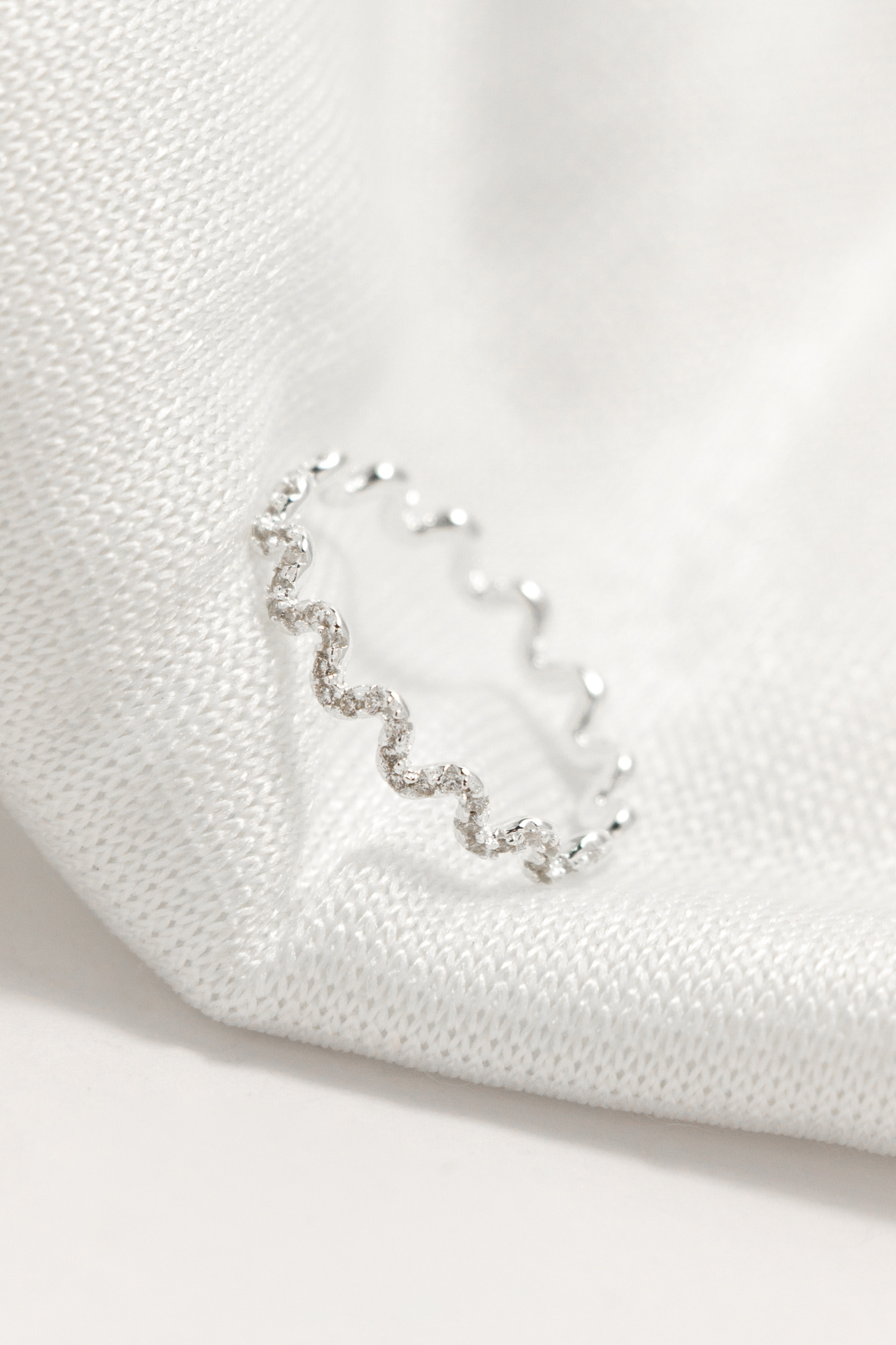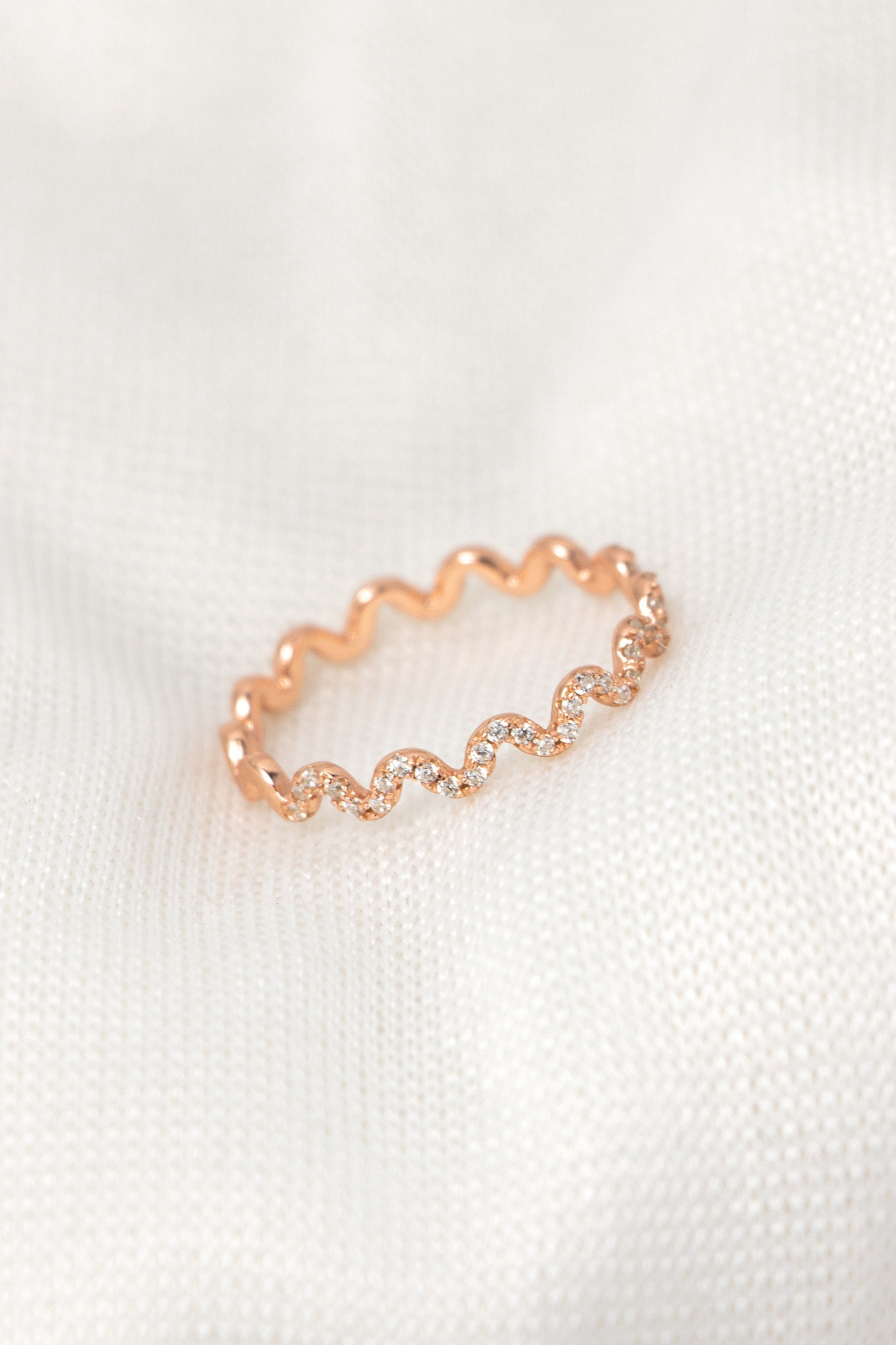 以柔和波形線條延展戒身輪廓,半圈細鑽沿線點綴,