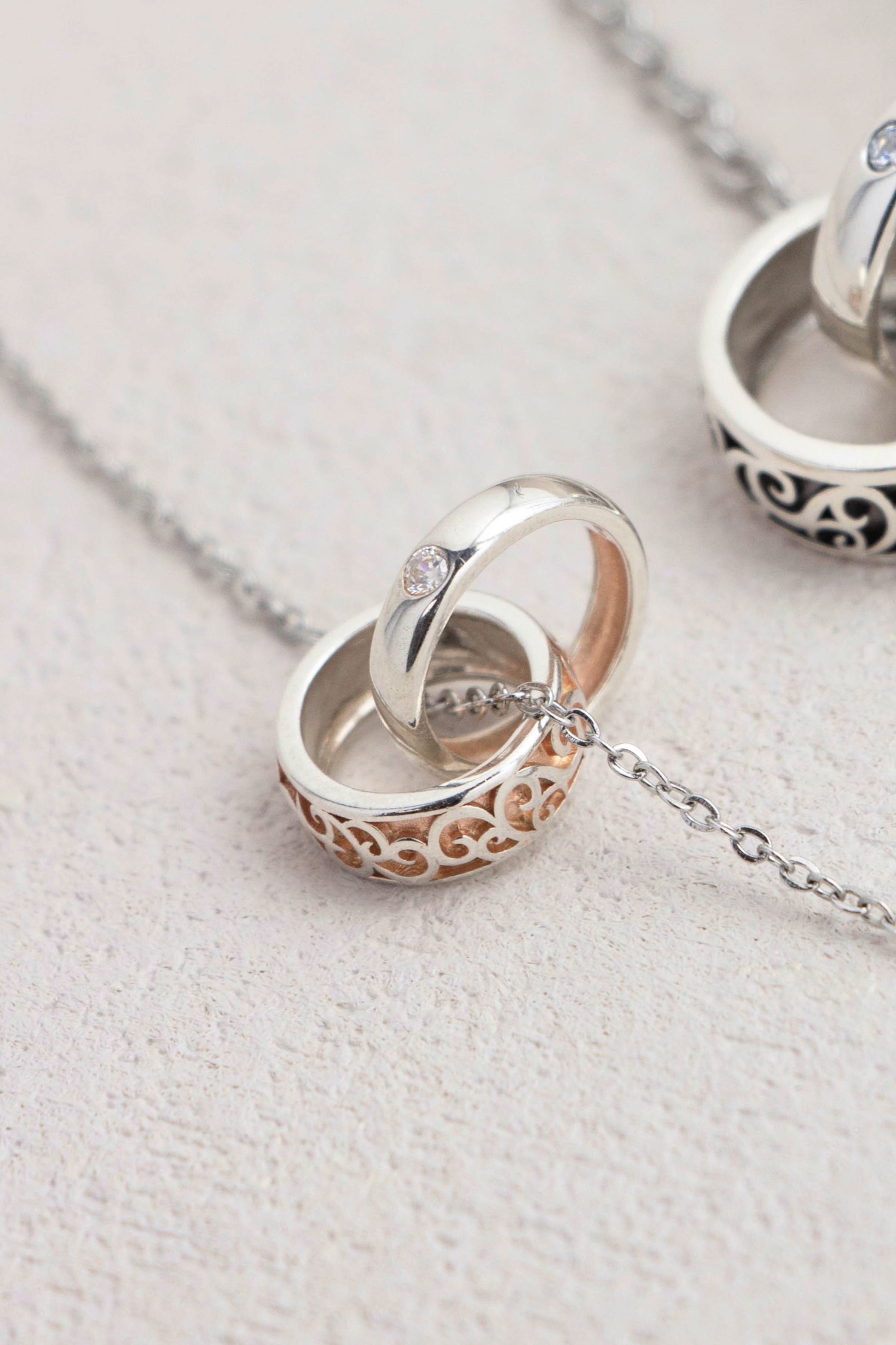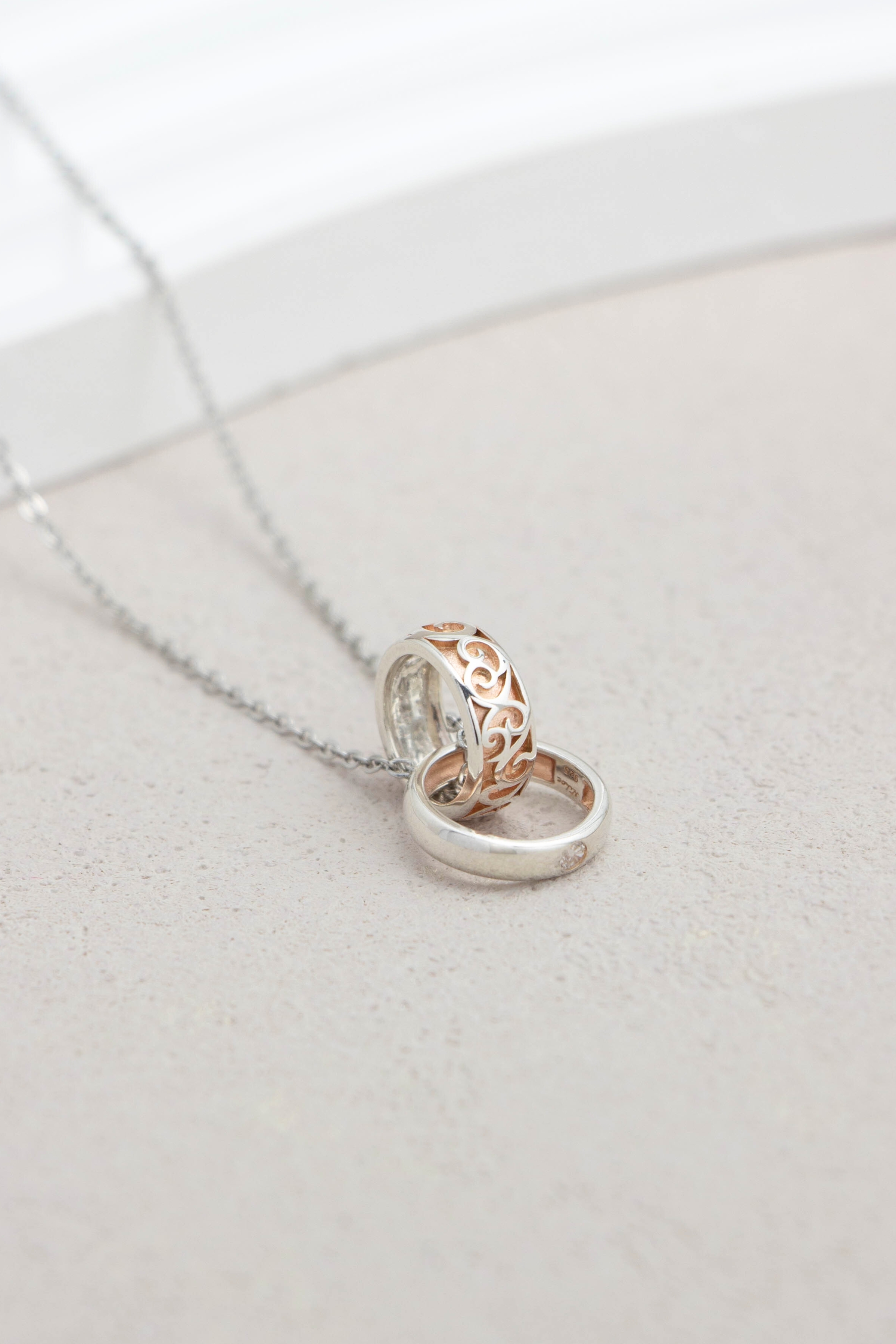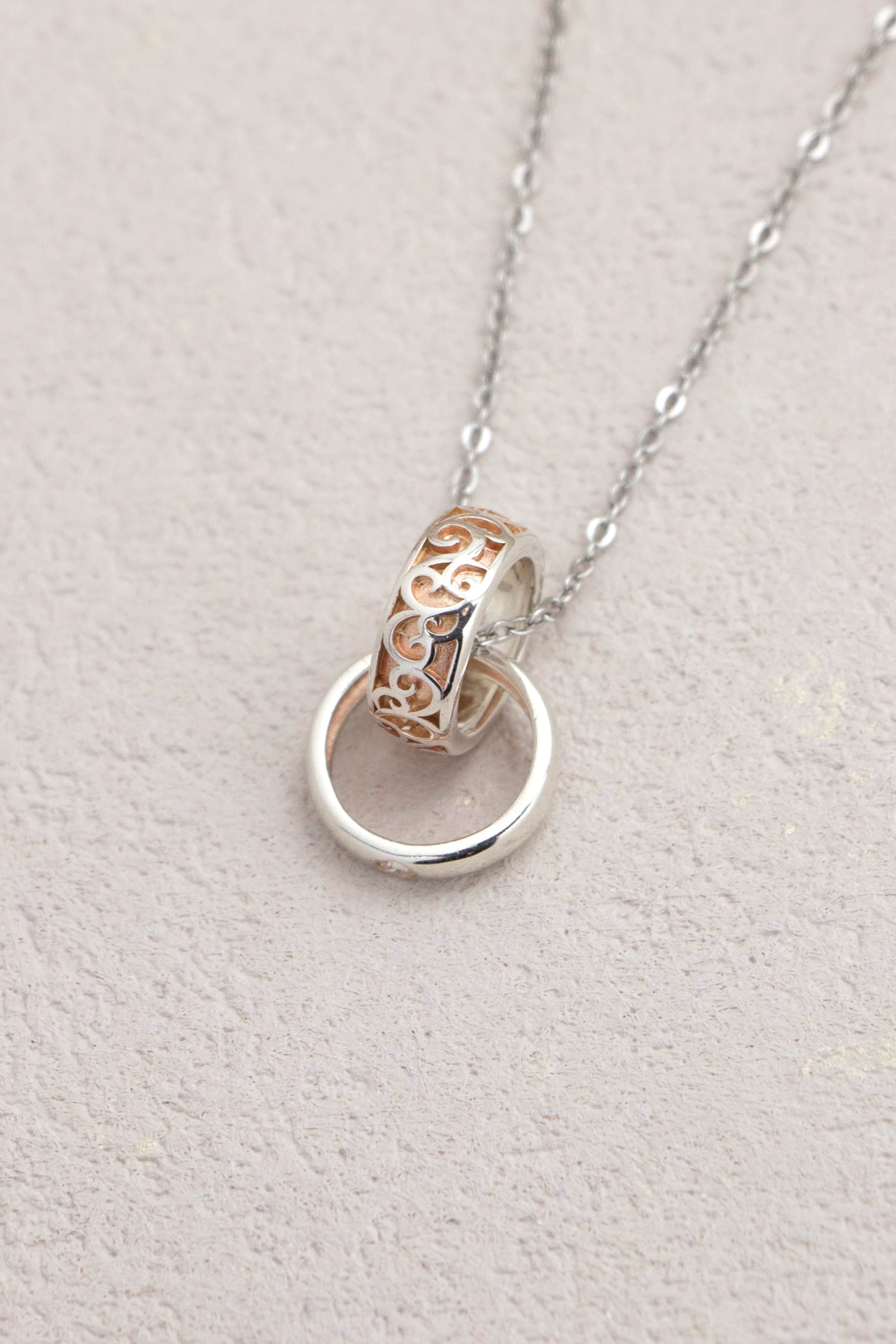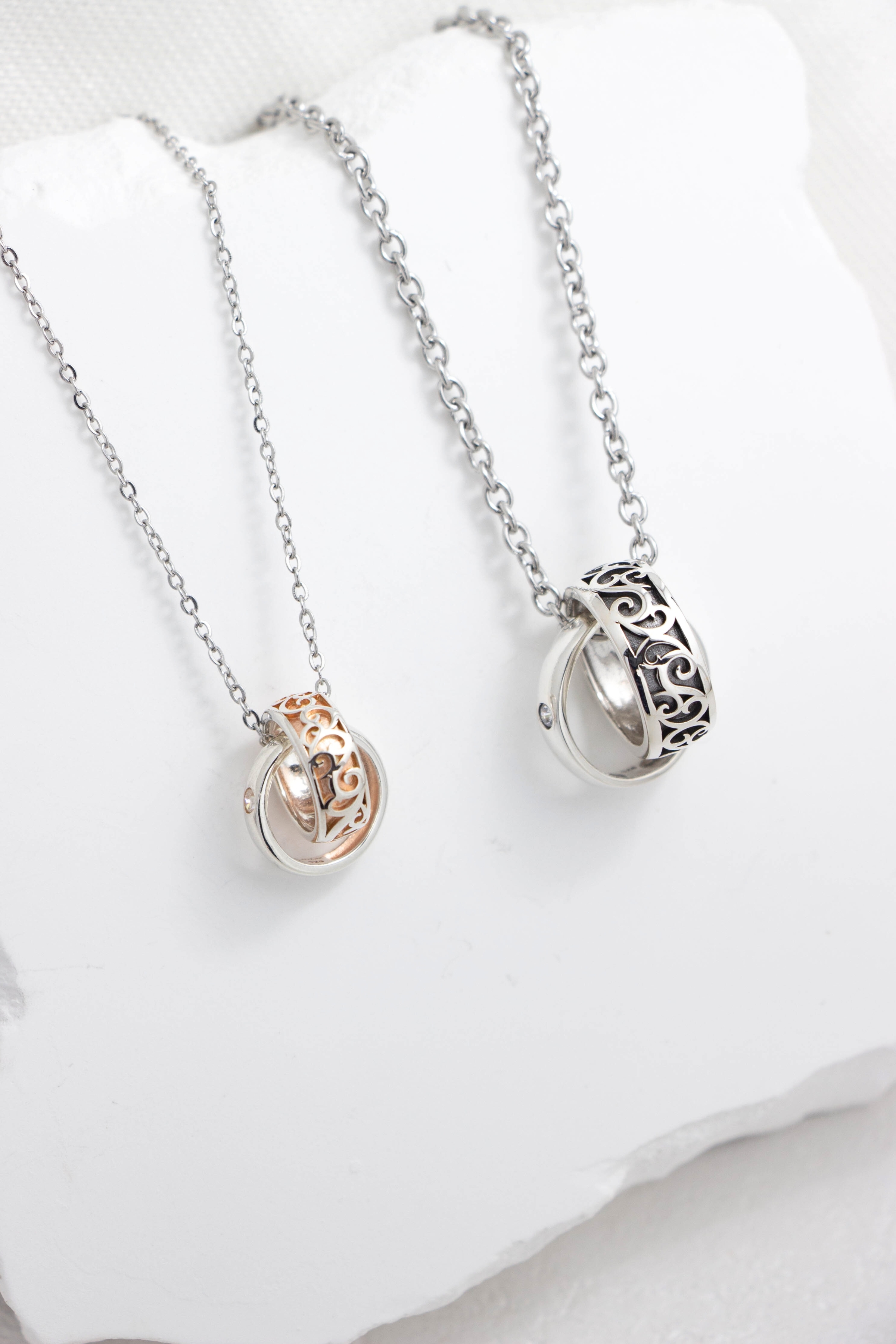 此款情侶對鍊以圓潤戒圈結合鏤空紋飾為核心設計,
