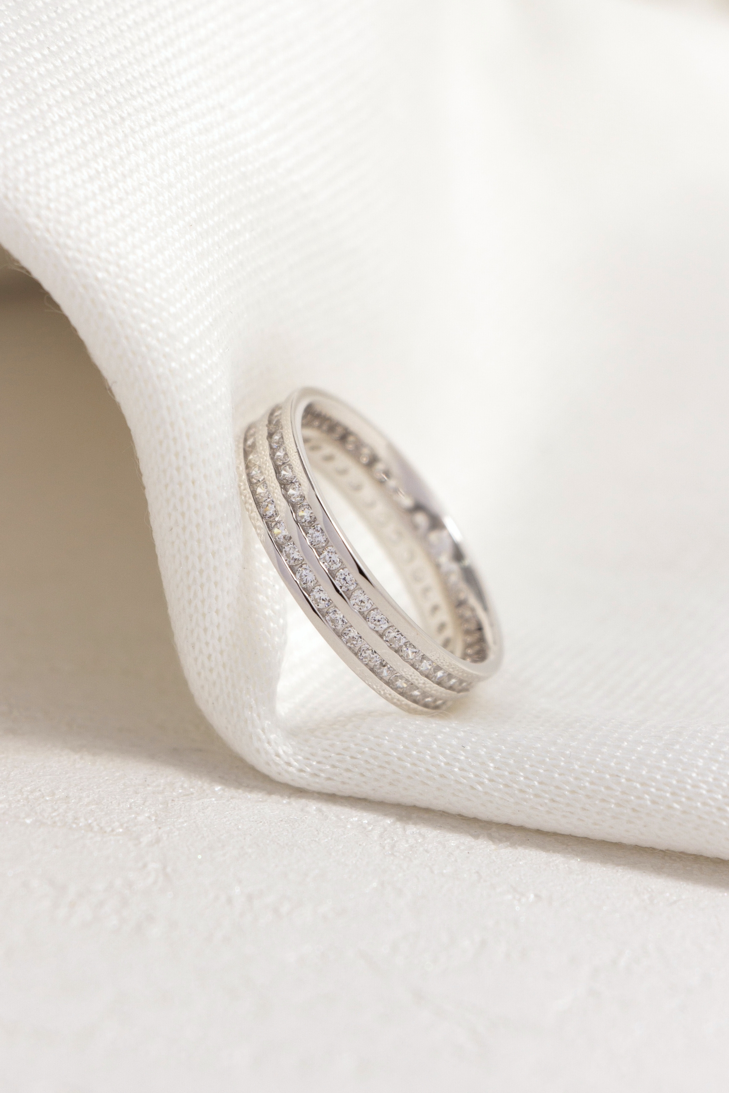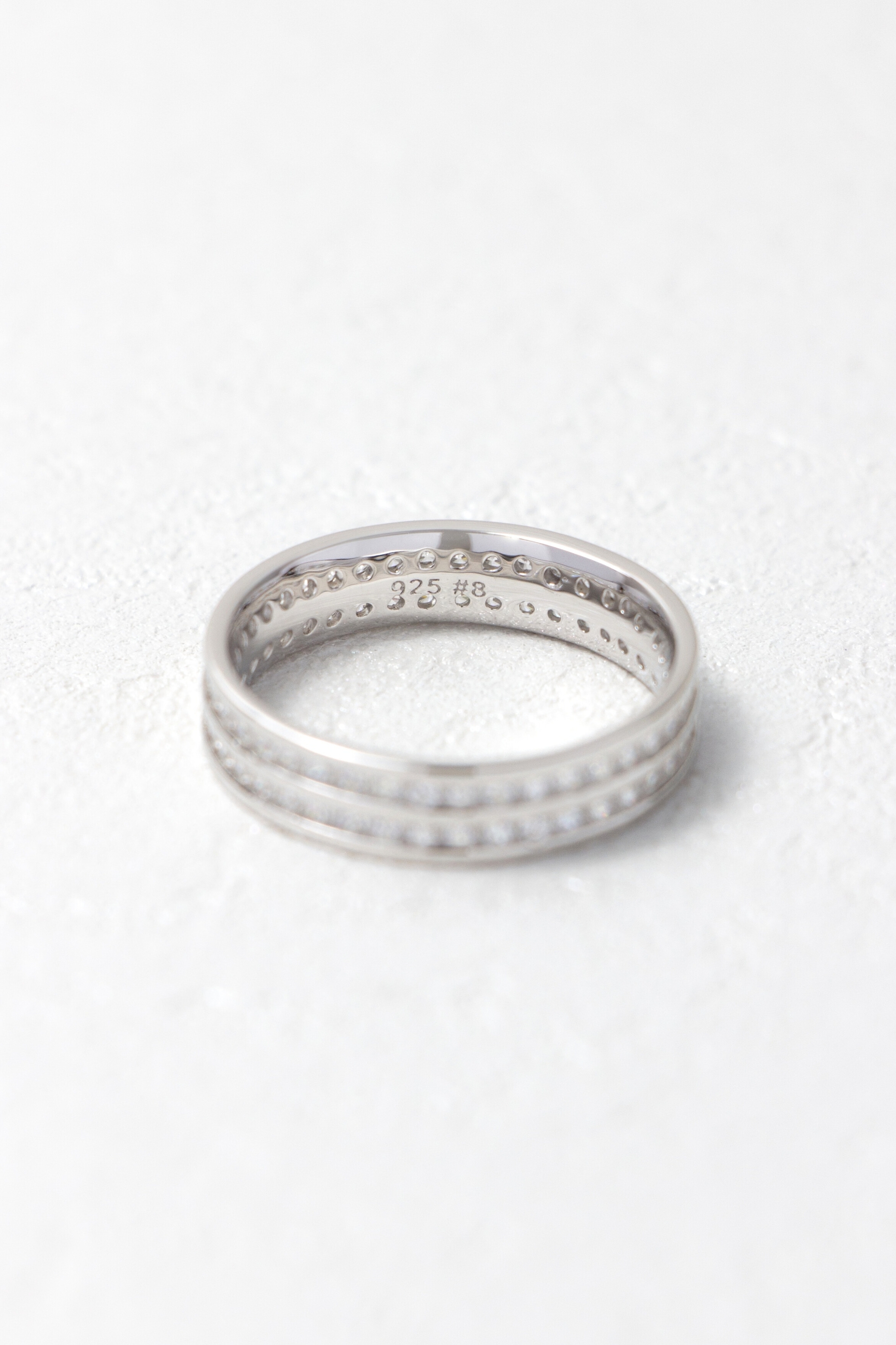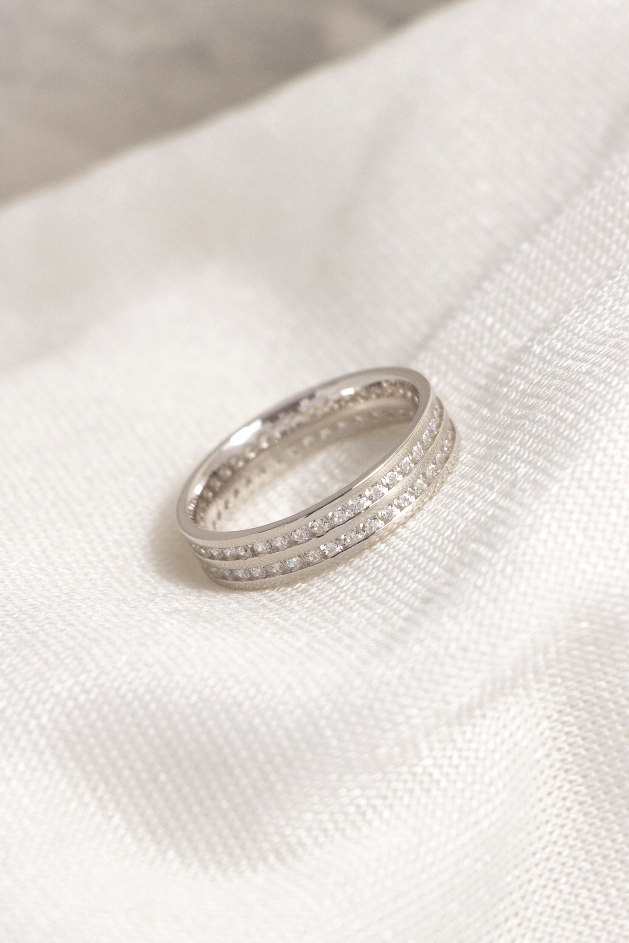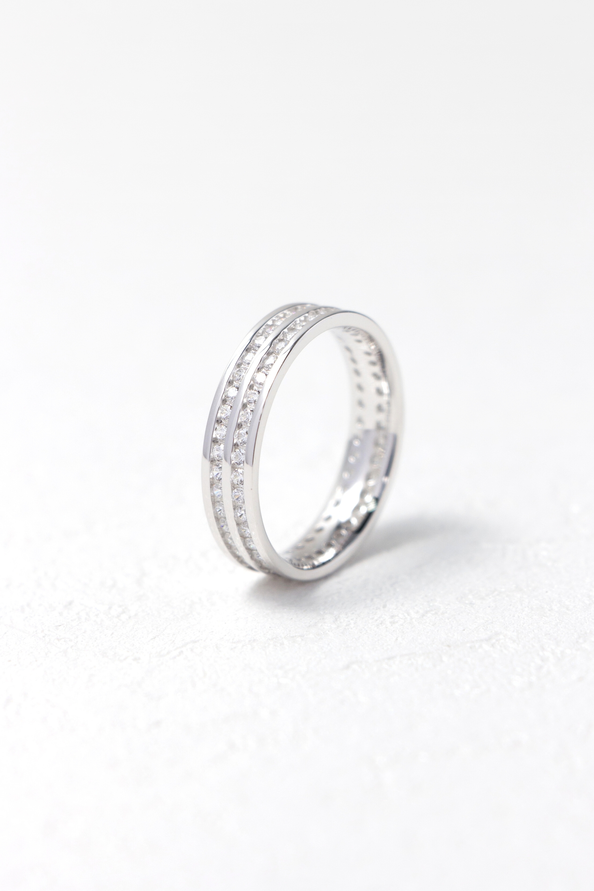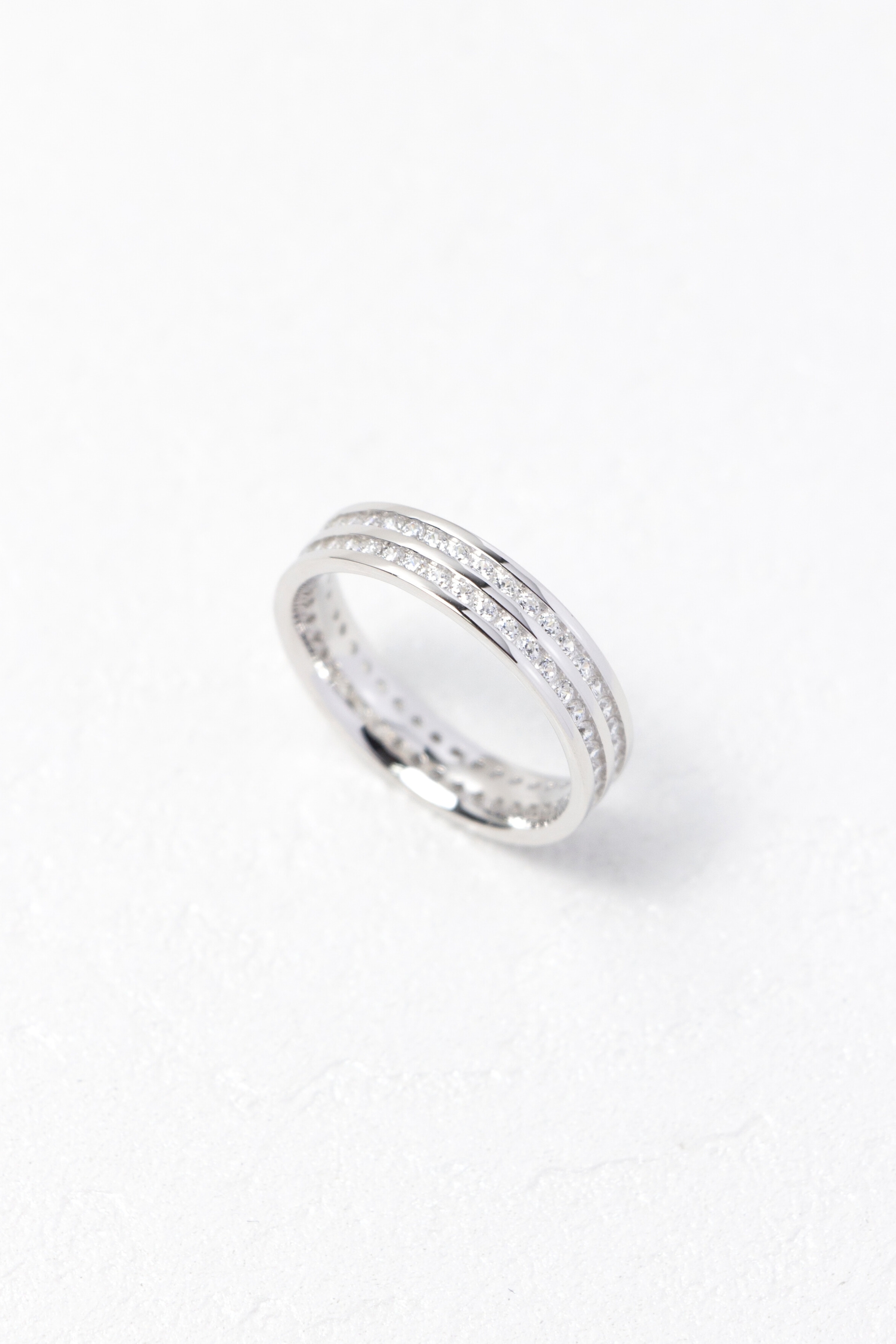 雙排鋯石鋪陳戒身光芒,細緻排鑲讓閃耀更顯克制。